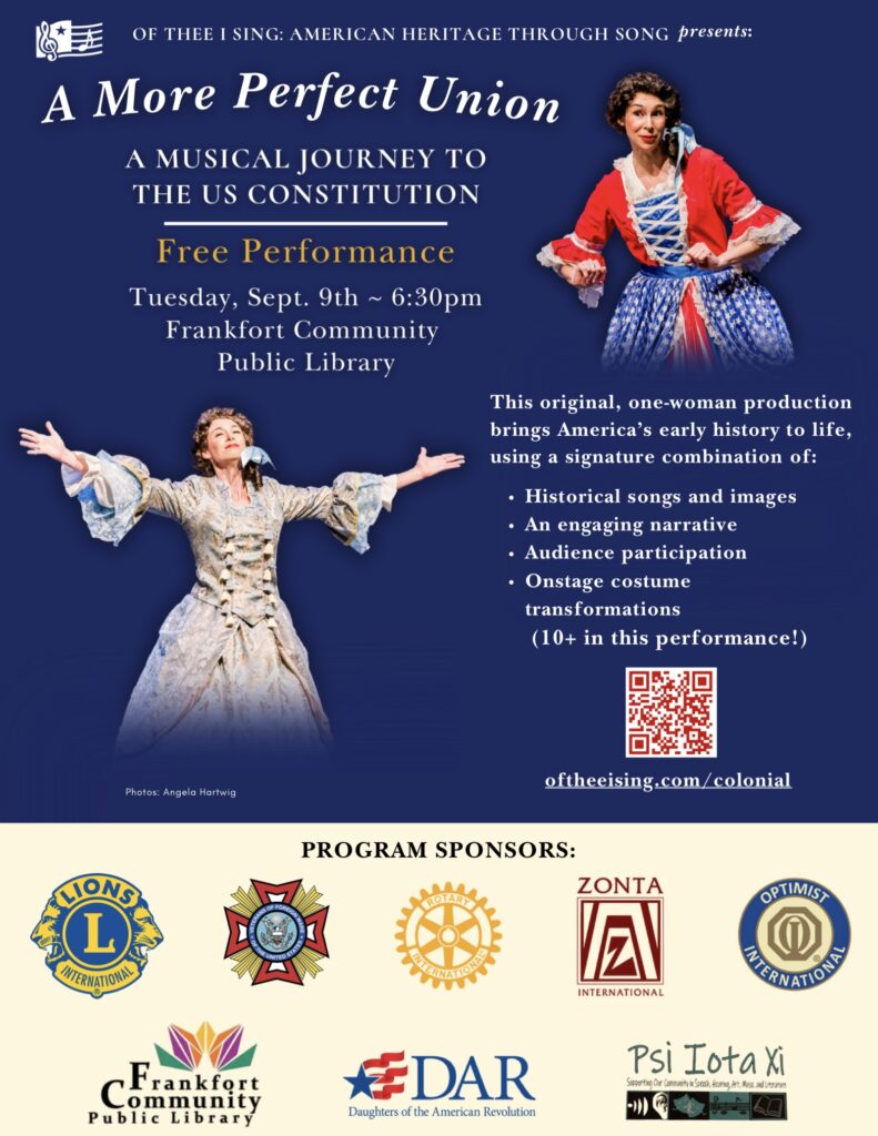 The Frankfort Community Public Library is thrilled to host “A More Perfect Union” a special musical event brought to you by the Frankfort Lions Club in collaboration with the DAR, Daughters for the American Revolution, Frankfort Optimist Club, Psi Iota Xi, Rotary Club of Frankfort, VFW Post 1110, and Zonta Club of Frankfort.