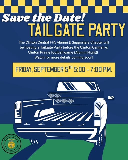Join The Clinton Central FFA Alumni & Supporters on Friday, September 5th from 5:00 PM – 7:00 PM for tailgate party before the Clinton Central / Clinton Prairie football game — Alumni Night.