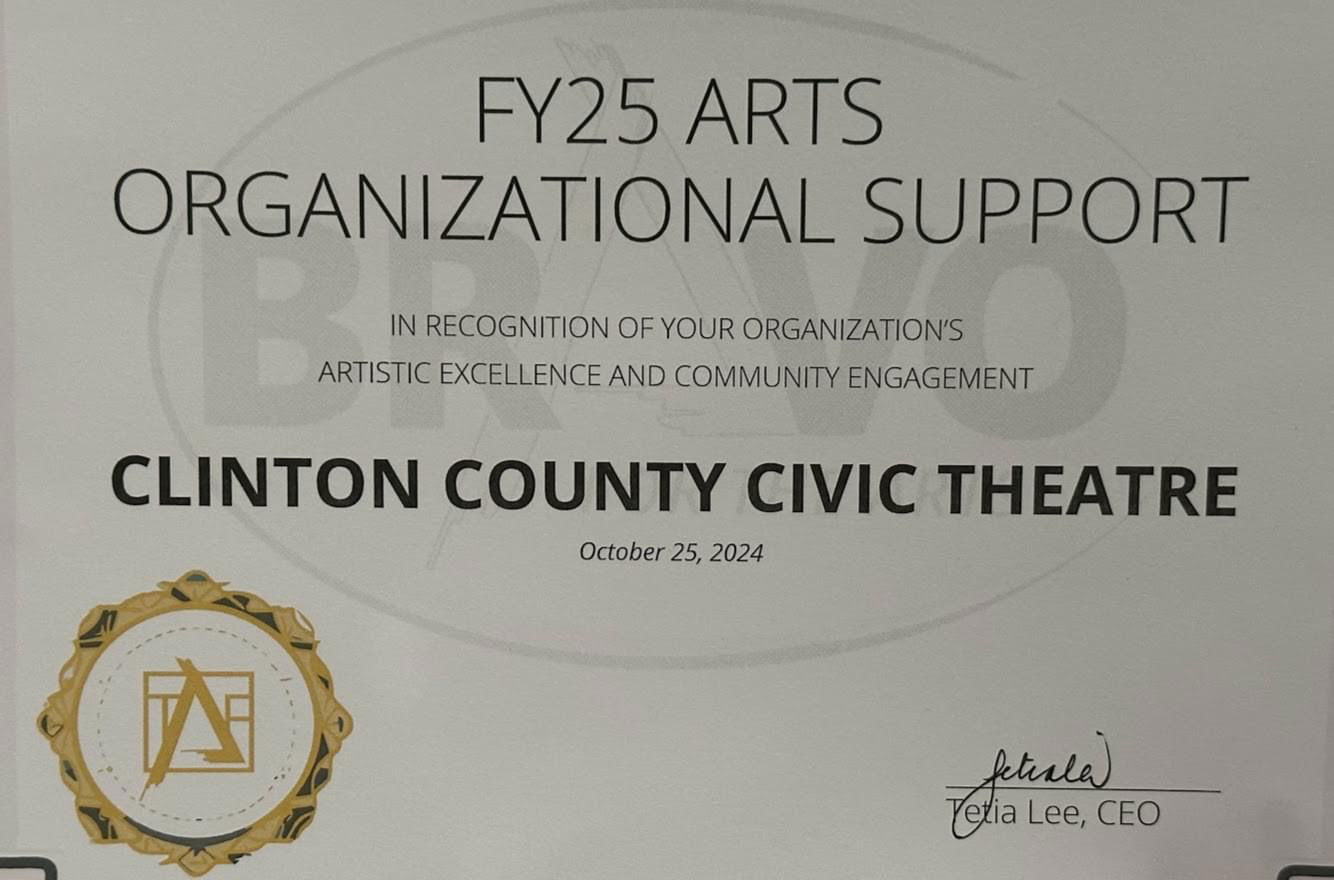 The Clinton County Civic Theatre received a recognition during the Bravo for the Arts Celebration for their continued investment into the arts in Clinton County and the surrounding region.