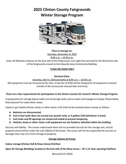 The Clinton County Fairgrounds will once again offer its Winter Storage Program for RVs, boats, and other motorized equipment. Storage drop-off will take place on Saturday, November 8, 2025, from 8:00 a.m. to 10:30 a.m. at the Edwards Jones Community Building, located on the northwest side of the fairgrounds. Entry is available from Alhambra Avenue on the east side of the grounds. Payment is accepted by cash or check only.