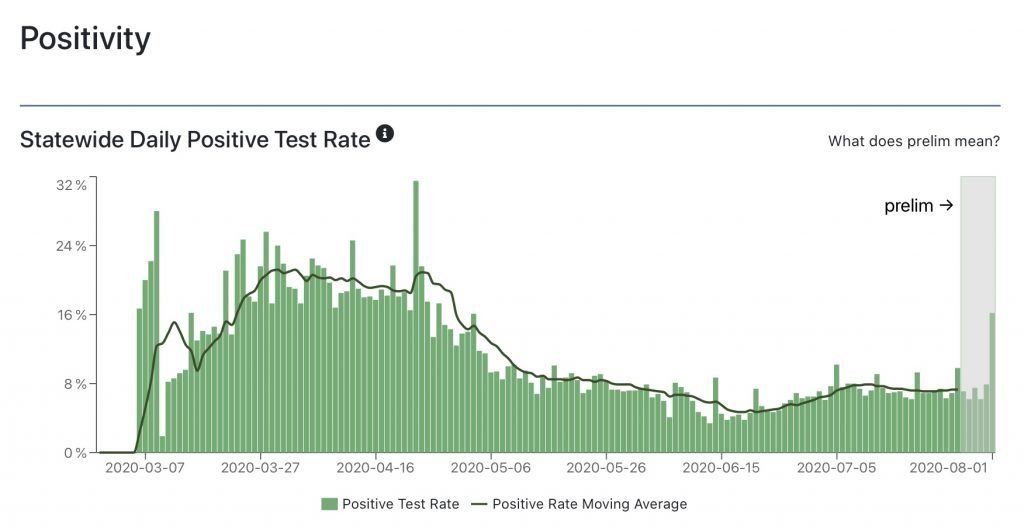 State-wide cases experienced a surge in March and April. State-wide case count then diminished daily until the end of June and then the daily case count has been rising quickly since the end of June. (See last graph below)