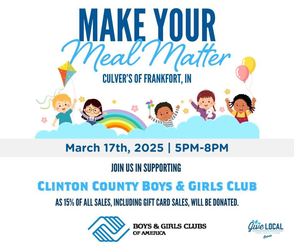 The Frankfort Culver’s location at 2301 E. Wabash St. has announced that it will host a “Make Your Meal Matter” dine to donate event tonight, Monday, March 17 in support of the Clinton County Boys and Girls Club.
