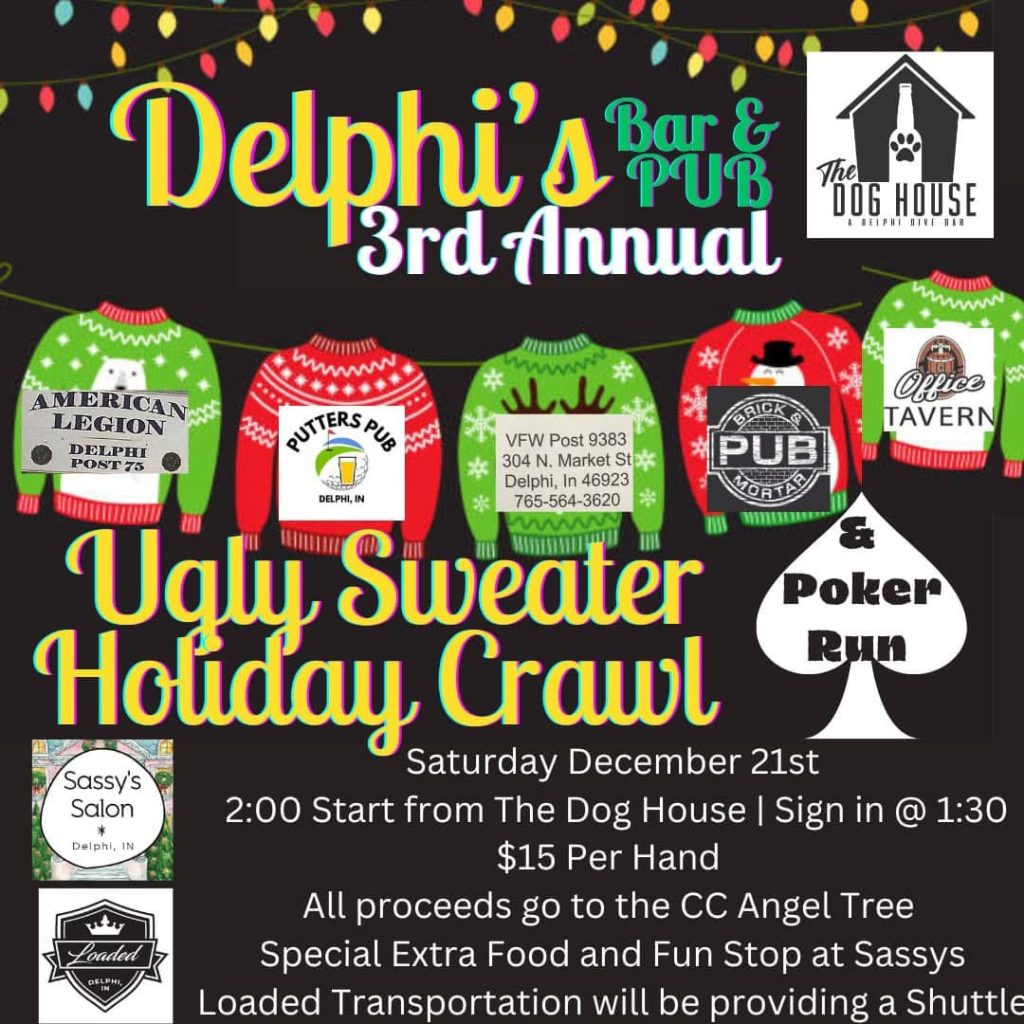 The Dog House in Delphi is gearing up for its 3rd Annual Ugly Sweater Holiday Crawl and Poker Run set for tomorrow, Saturday, Dec. 21 for an afternoon of exploration in the Delphi area while supporting a local cause.