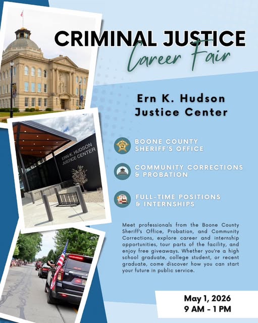 The event will take place on May 1, 2026, from 9:00 a.m. to 1:00 p.m. at the Ern K. Hudson Justice Center. Representatives from the Boone County Sheriff’s Office and Boone County Probation & Community Corrections will be on hand to discuss career opportunities, including: