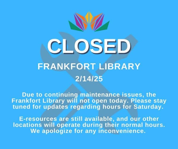 Frankfort Library Announces Frankfort Branch is Closed Today, Feb. 14