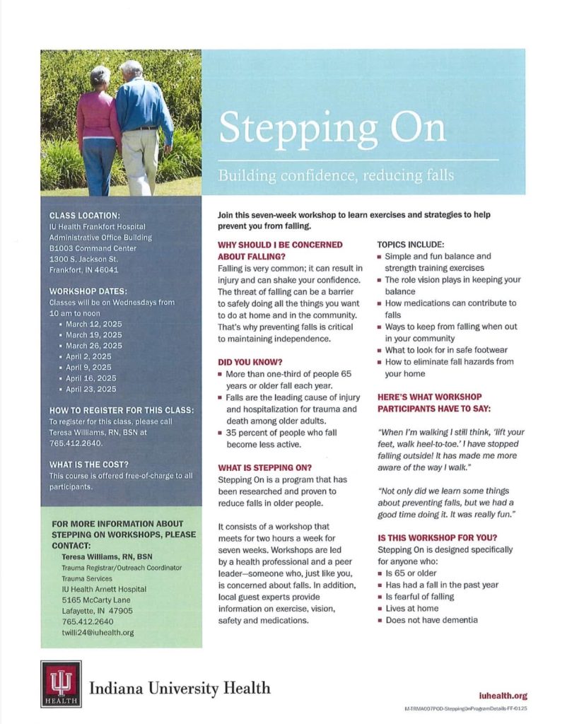 IU Health Frankfort announced the upcoming workshop dates for its “Stepping On” class that intends to help senior citizens improve balance and strength to avoid falls in the future, and Paul Phillippe Resource Center released that they will provide transportation for seniors seeking to participate in the class.