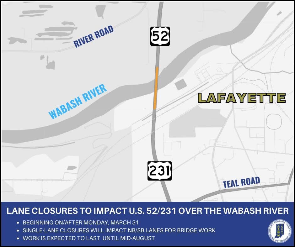 The Indiana Department of Transportation announced single-lane closures on U.S. 52 and U.S. 231 northbound and southbound over the Wabash River in Tippecanoe County.