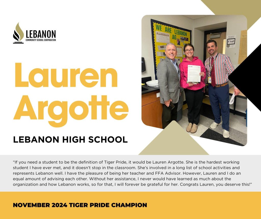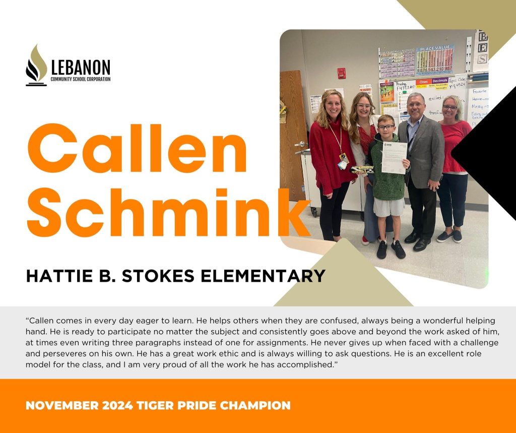 Lebanon Community School Corporation has announced the November Tiger PRIDE Champions for the 2024-2025 school year with picks from every elementary school, two from the middle school and two from the high school.
