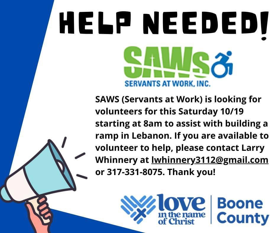 Love INC Boone County and Servants at Work, SAWS, are seeking volunteers to assist with the building of a ramp in Lebanon to benefit those with disabilities in the community tomorrow, Saturday, Oct. 19.