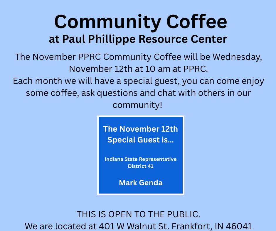 The Paul Phillippe Resource Center invites the public to Community Coffee on Wednesday, November 12, 2025, at 10:00 a.m.. The event will feature special guest Indiana State Representative Mark Genda (District 41).
