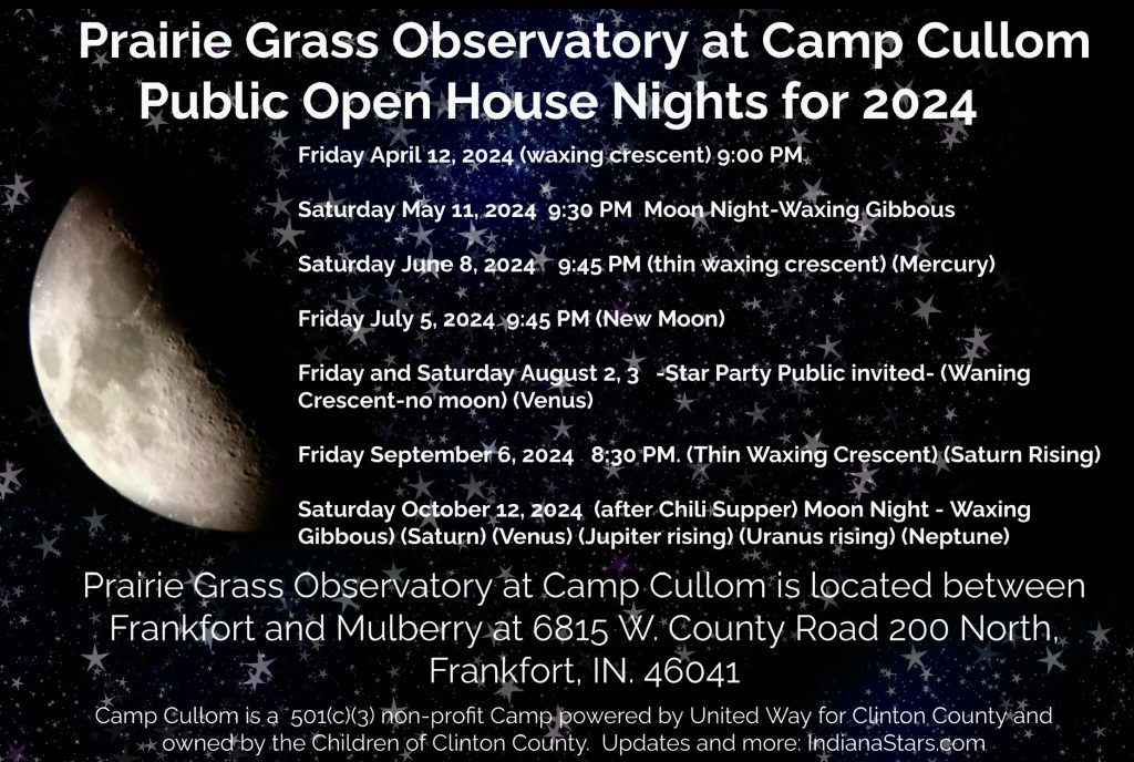 This years “Indiana Family Star Party” is the largest astronomical event in Indiana. The Indiana Family Star Party will be held at Camp Cullom from Tuesday July 30th to Sunday August 3rd. More Indiana Family Star Party information is available HERE.