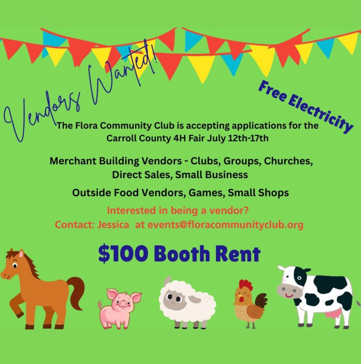 The Flora Community Club is accepting application for the Carroll County 4H Fair July 12-17. Merchant Building Vendors, Clubs, Groups, Churches, Direct Sales, Small Business are all welcome. Booth Rent will be $100 with free electricity access.