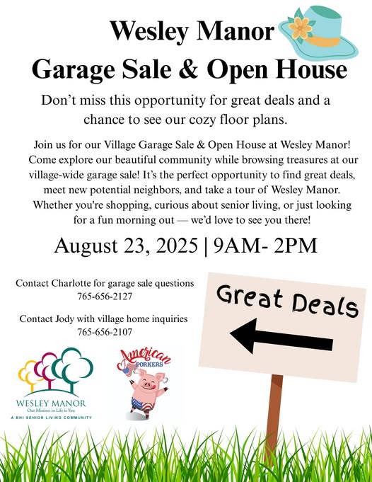 For questions about the garage sale, contact Charlotte at 765-656-2127. For inquiries about village homes, contact Jody at 765-656-2107.