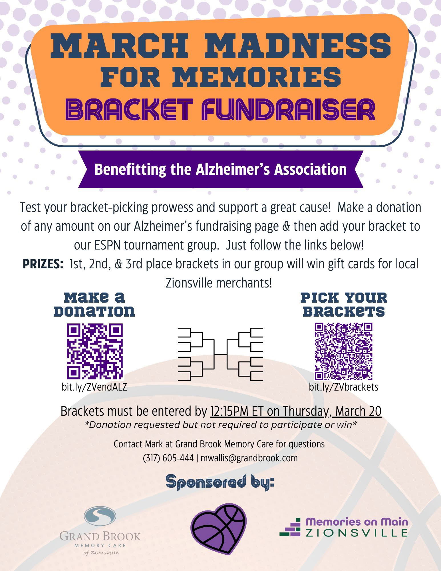 Zionsville Memories on Main has announced the March Madness for Memories Bracket Fundraiser where community members may join the tournament group on ESPN and make a donation on the organization’s Alzheimer’s fundraising page to participate.